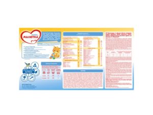 - Младенческая сухая молочная смесь Малютка 2. Она предназначена для малышей от 6 месяцев до 12 месяцев.